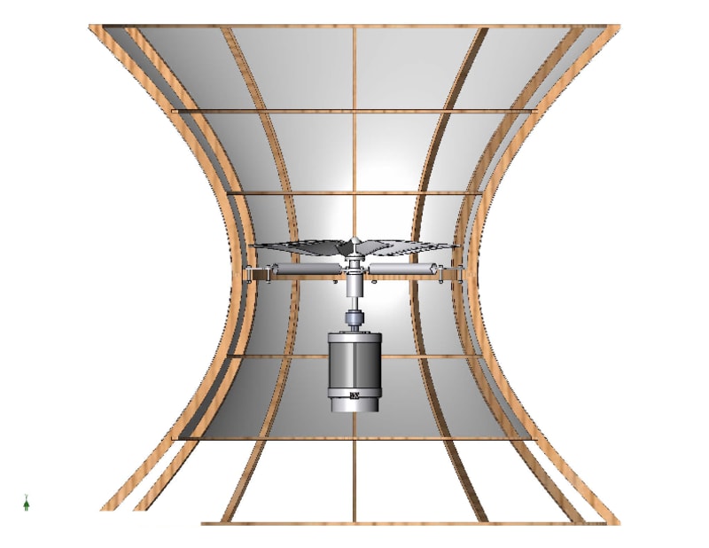 The sun heats the top inner surface of the hyperbolic tower causing the air to rise, drawing air from the bottom through the center of the tower. Air flowing through the center of the tower speeds up according Bernoulli's Theorem, which states that an increase in the speed of moving air or a flowing fluid is accompanied by a decrease in the air or fluid's pressure. A propeller situated at the center of the tower is attached a generator producing electricity in very hot, arid locations.