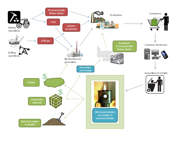 The concept presented here is to develop a microwave plasma processing concept that can be used to redirect the stream of electronic waste from a path that leads to toxification of the environment and loss of valuable resources in the form of precious metals and rare earth elements to a path that leads to an environmentally impact neutral and economically viable cycle of material reclamation and reuse.