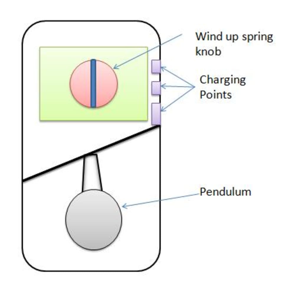 Another feature of this device is that it has an alternate spring wind up mechanism that will allow the user to charge the battery when he/she is not walking.