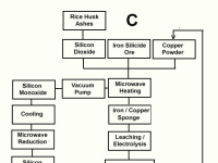 We show here three flow sheet drafts for obtaining it. Figure A shows the production of the metal from Rice husk ashes using Copper powder both as a heating element and a catalyst. Figure B shows the intermediate production of Silicon Monoxide gas for obtaining the metal instead of using the refractory Silicon dioxide for that purpose. Figure 3 shows the obtention of Silicon Monoxide from naturally occurring silicides.
