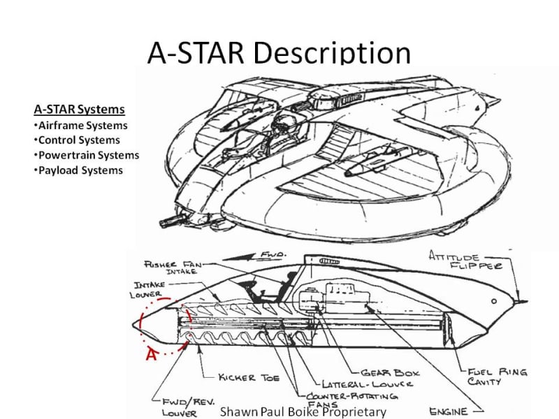 Characteristics-Aural Level will be 80% less than a Helicopter because of its sound absorbing ducting system. A small radar cross-section will be apparent due to improved shape and RAM materials. Defensive and offensive armament can be packaged into the A-STAR’s design.