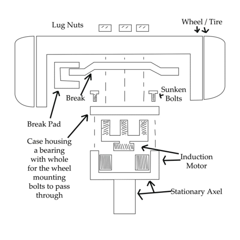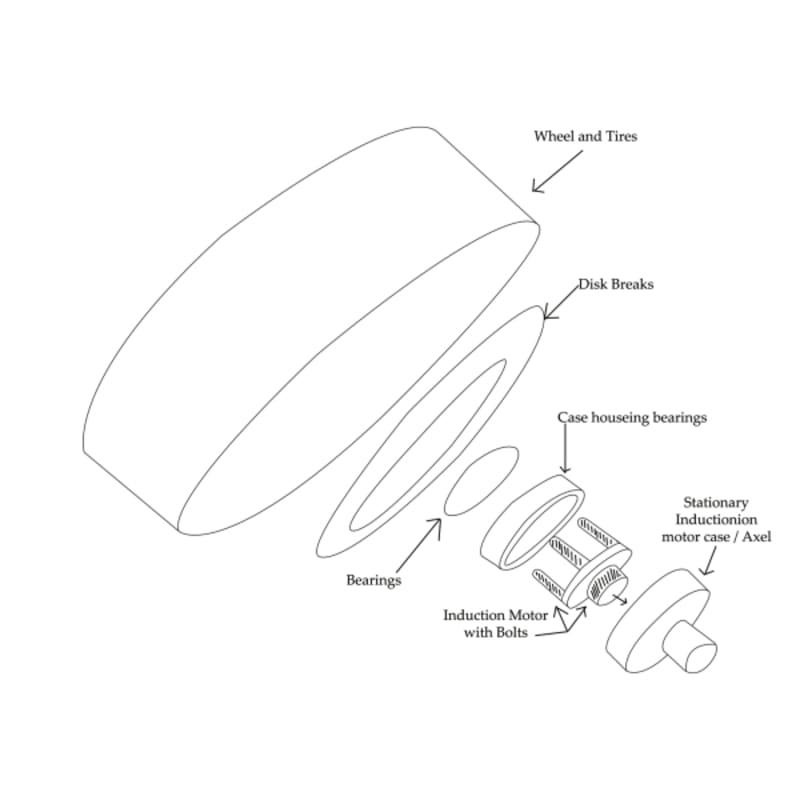 Manufacturing of this product would be the fun part. Because there are many different types of vehicles and different types of axle/wheel designs we would have to make a few different kits. One simple option, like demonstrated in my drawing, is stop the axle from spinning, pin/weld it. We would then be able to attach the Induction motor to the axle and then reattach everything we took, without sacrificing anything he car has to offer.