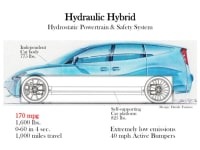 The proposed 5-seat Hydraulic Hybrid weighs 1,600 lbs. (-50%), is more fuel efficient (170 mpg, NEDC) less polluting (-85%) and safer. The car consists of a drivable powertrain platform (770 lbs.) and car body. The powertrain, using pressurized fluid to transmit the power, consists of a hydraulic free-piston engine, an accumulator storing the fluid from the engine, and hydraulic wheel motors to drive and brake the car. The very rigid accumulator builds the backbone of the self-supporting platform. Active hydraulic bumpers are attached to it and extend automatically before an impact occurs absorbing the crash energy from speeds up to 40 mph. The powertrain requires little space, and the body becomes light and simple.
