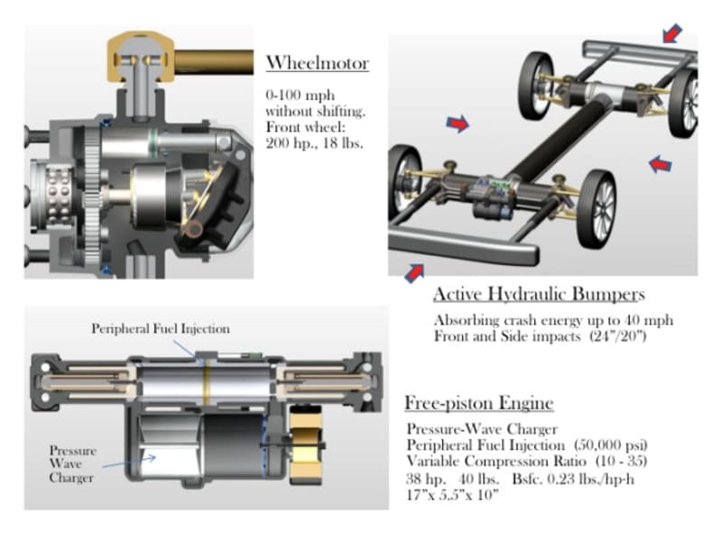 The engine is a 1-cylinder, 2-stroke free-piston Diesel engine with opposed pistons, an exhaust gas driven pressure-wave charger, and ultra-high pressure (50.000 psi) peripheral fuel injection system. This configuration provides an improved piston velocity profile around TDC and a continuously adjustable compression ratio, allowing for the use of all combustible fuels and gases. High thermal efficiency, noticeably reduced heat and friction losses, and significantly improved atomization and distribution of the fuel result in low consumption (-25%) and reduced emissions. The expected reduction in CO2 (-85%) is proportional to the fuel consumed. A nearly elimination of NOx and soot is expected since tests by research institutes (SWRI, TU Karlsruhe) with less sophisticated injection systems have already reached comparable results.