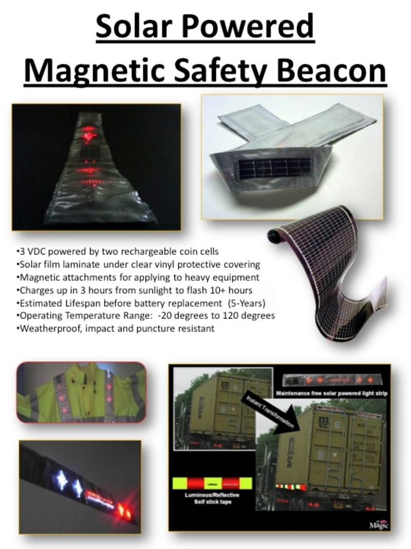 We're attempting to fill the need to illuminate containers dropped onto flatbeds being driven on highways throughout the world without any lights. Presently all trailers have lights on their top perimeters making them visible, but no such lighting exists on containers. This invention addresses that and may be useful in other areas as well. The rare earth magnets embedded inside the strip holds it tight to metal containers. The protected flexible solar film charges two small coin cells also embedded in the strip. Charging to full capacity in less than 3 hours outdoors with or without direct sunlight, the unit stays lighted constantly through a 10 hour dark period. Using a current-saving method feeding a single led attached to 300 durable PMMA plastic optical fibers with their tips welded into 3M reflective fabric forming large diamonds and lines, the strip is able to withstand all types of weather conditions and a great deal of abuse. Since there are no LEDs or electronics exposed at the surface only the clear silicon rubber layer, the strip can withstand impacts directly from a hammer without any adverse affects. Strength is necessary when considering lifting heavy containers that might bump into others while stacking. The strip should last 5 years before replacement with no battery replacements necessary.