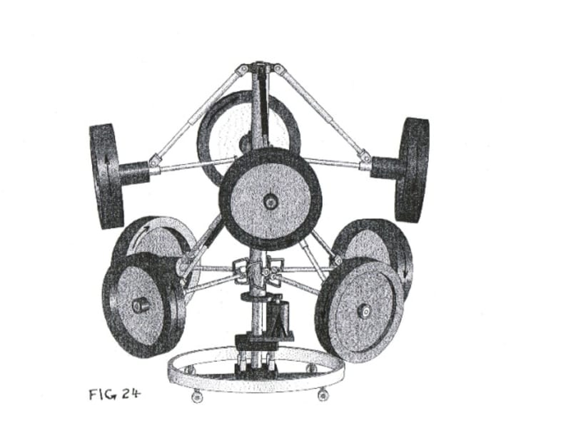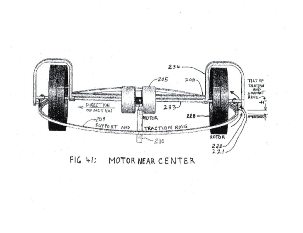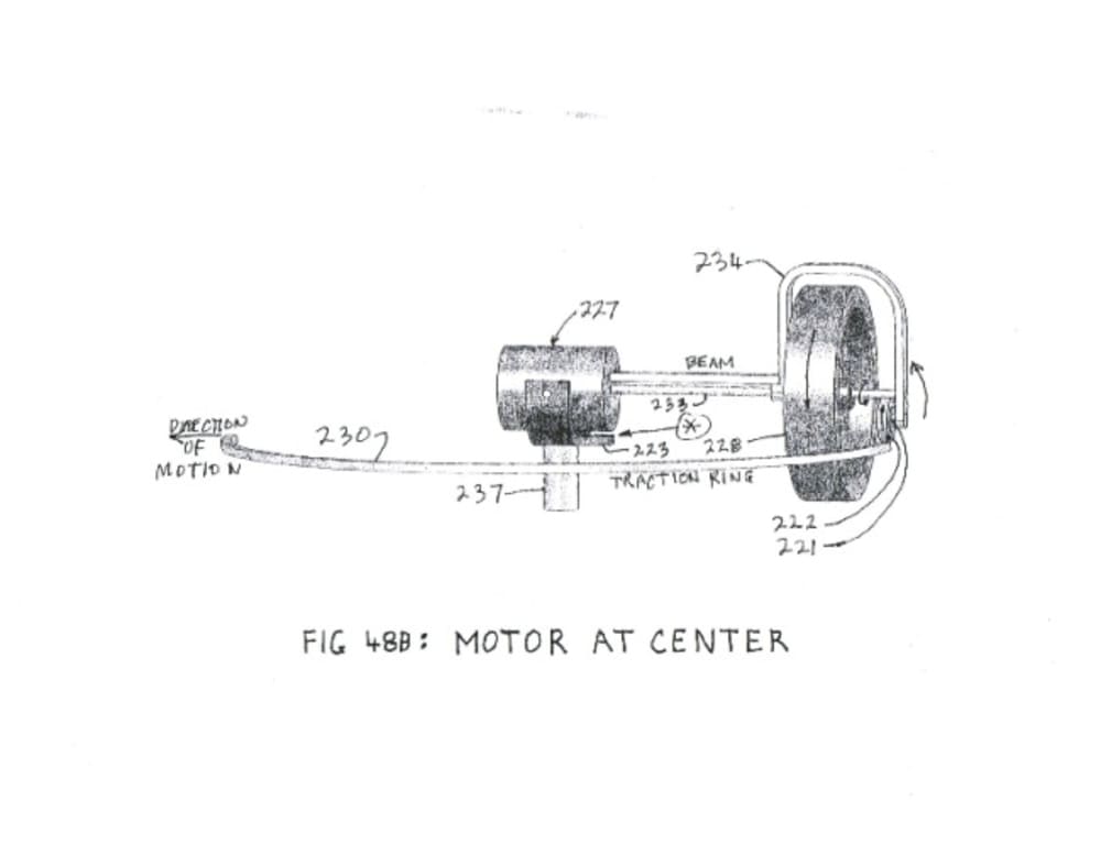 Figure-48B, US patent 7,900,874 shows a configuration using only one moving part. Figure-41, US patent application 12,931,856 shows an advanced version with two rotors 180º apart, analogous to full-wave rectification. Two more rotors could be added, each 90º apart. These horizontal motion devices require earth’s gravity to produce precession in the horizontal plane, thus converting a vertical force to horizontal motion. Combined angular momentum of the HMT-IPD/Earth is conserved via earth’s gravity. The Figure-48B device has been successfully prototyped and tested. Each full cycle produces net forward motion. Four rotors result in uniform velocity.