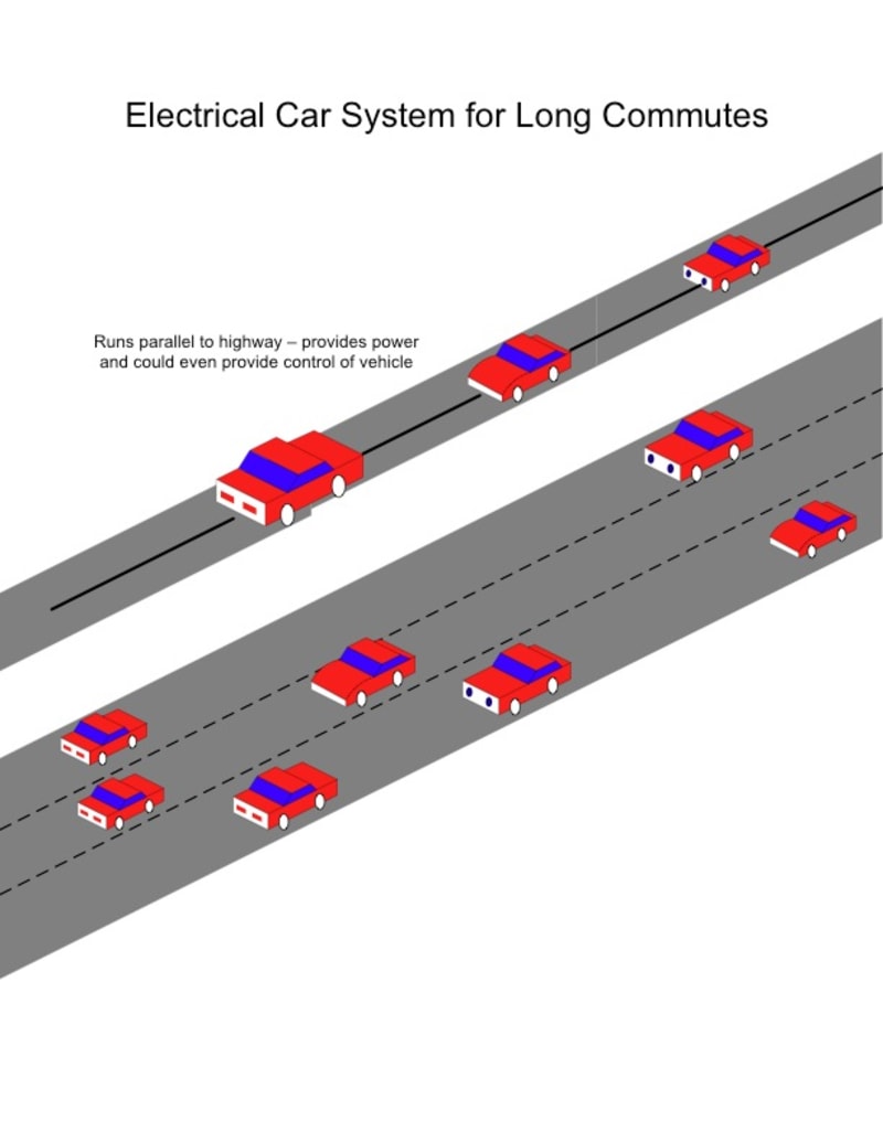 Electrical automobiles may be the best answer to minimize greenhouse gasses and decrease the cost of commuting. While electrical automobiles have been around for a long time, the current designs are best for short trips around the city. Ideally, the traveler can get to work and get home with only one battery charge, so that the car can be recharged overnight in the owners garage. For longer commutes, electrical cars cannot be used. What if I had an electrical car tha't I could drive for unlimited miles on certain highways? Perhaps this car could be driven as usual on normal roads, but when on the special highways it would drive itself, allowing me to have some coffee and read the paper! This concept is well within today’s technical capabilities. The worst problem would be coordination: automobile manufactures, electrical companies and highway departments all working together to make this a reality. The basic concept is a cross between an automobile and an electrical trolley car. An electrical car would have a connector that could hook up to a side rail or road rail. The rail would provide power to the vehicle and would also take control of the vehicle while the car is attached.