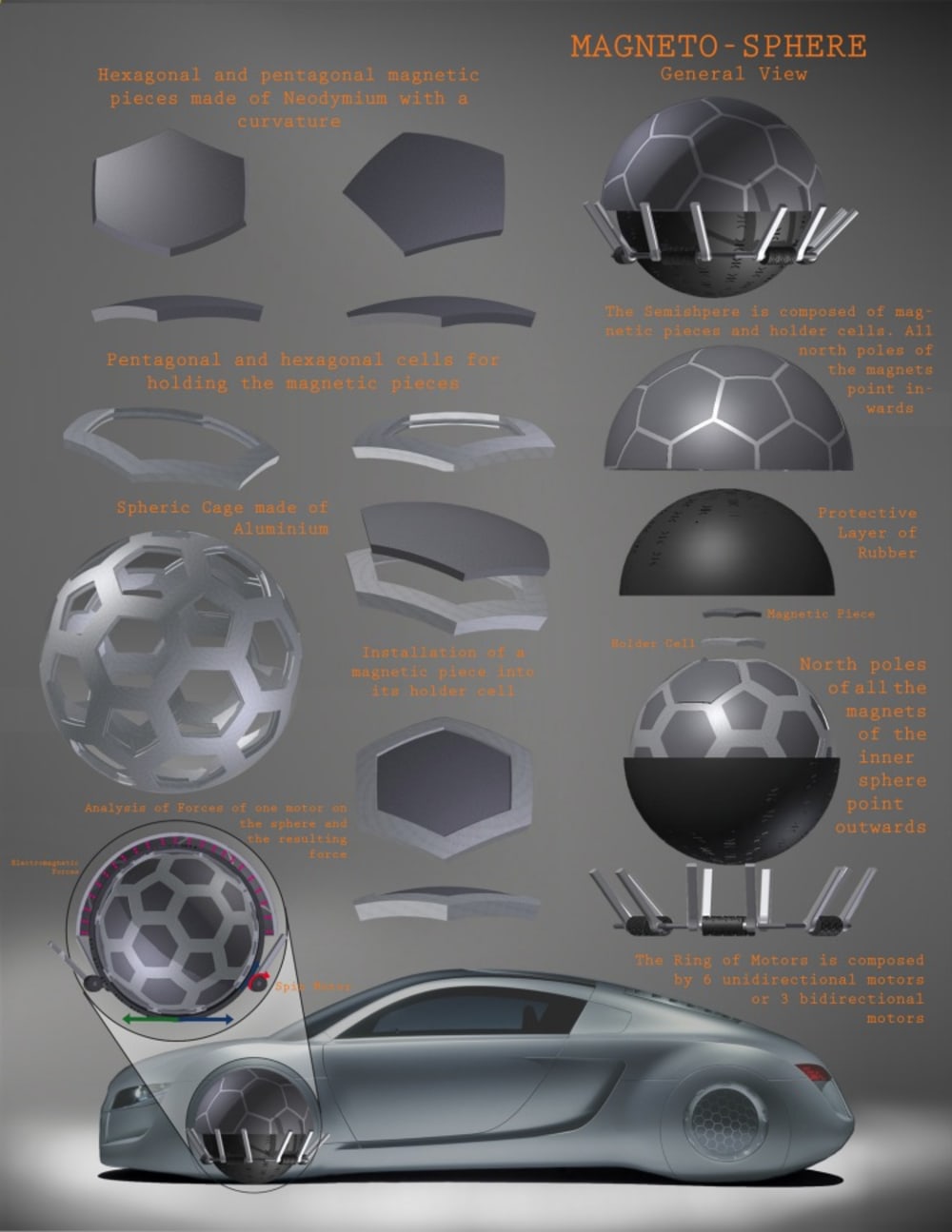 The Magneto-Spheres are the next generation tires based on the attraction and repulsion of magnets. Pieces of permanent magnet of Neodymium with curved hexagonal and pentagonal shapes are arranged in such a way that, helped by a spherical cage of holder cells, create a magneto sphere; just like a bucky ball (fullerene) or a football, also the sphere will be covered by a protective layer of rubber. Apart of this it is important to point out that all of the magnets have their north poles pointing outwards. Additionally to the original sphere there will be a semi sphere above it, this semi sphere will be created in the same way as described above but the north poles will point inwards resulting in a high repulsive force between the sphere and the semi sphere. To assure the sphere’s movement a ring of electrical engines is situated below the sphere. These motors will be powered by a central battery located in the car.