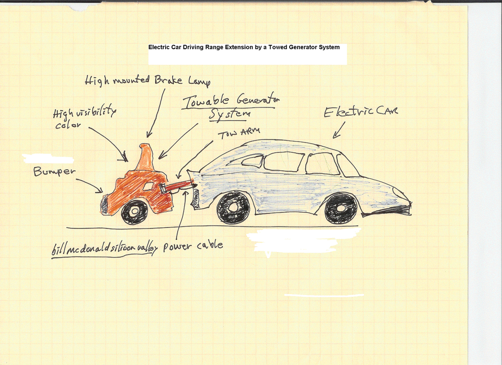 The system would “twin” the functions of the car's brake and turn signal, similar to most trailers. The tops of the turn signals would be mounted high enough that they would be visible in the rear view mirror of the electric car. This visibility would tend to reduce accidents from drivers forgetting the towed generator was present when backing up. A rear view camera would be provided to assist reversing.