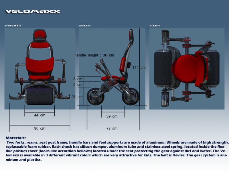 This wheelchair is inspired by racing cars and skate boards and designed for children. As an alternative to traditional wheelchair, Velomaxx is powered by arms. Therefore, every child, even kids with a disability who can’t use his/her legs, can enjoy a sportive yet comfortable ride. I wanted to create a wheelchair design that will allow kids to live their dreams of being a pilot of a race car, airplane or feel like they are in a science fiction world.