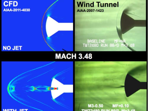 Applying supersonic counter-?owing cold gas jets of a certain mass flow rate and pressure at the nose of a supersonic vehicle can reduce drag, aerodynamic heating and possibly reshape sonic boom signatures.