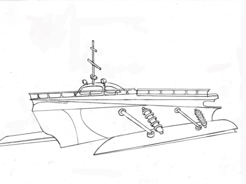 The submitted electro-trimaran differs from usual that pontoons are connected to the case of boat not rigidly, but hinged - by means of bars and springs. Therefore pontoons can move concerning the case.