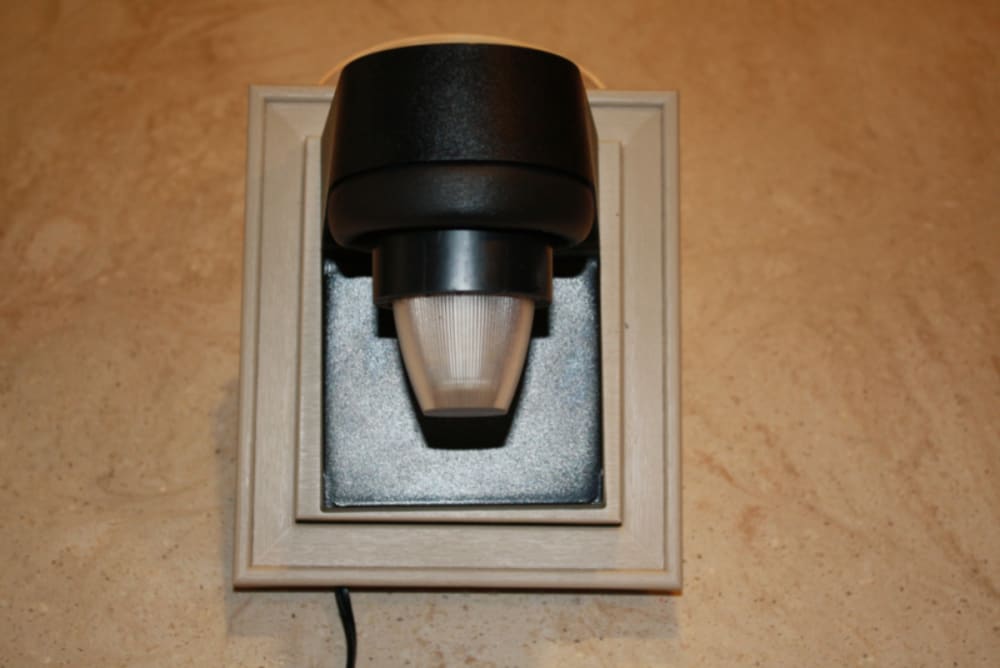 The fixture is made of polycarbonate plastic, lightweight, durable and web attachment resistant. Fitted with a dusk to dawn sensor and relay designed to operate daily on only at night. Low cost internal components provide adequate thermal transfer for qualification to its specified bulb, as well as active moisture desiccation to protect the sensitive electronics of led luminaries. A special rechargeable fiber gasket houses chemical spider repellant time release granules to further enhance bug less qualities and reduce maintenance costs of web and nest clean up.