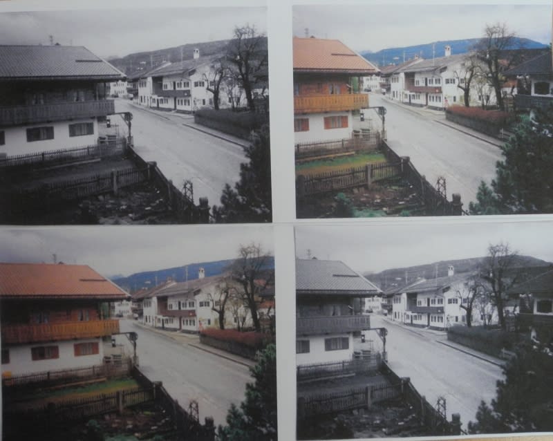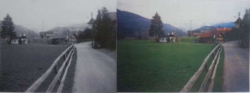 One photo in color, the other in black and white. Combining the two result in a full color 3D image.