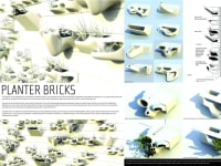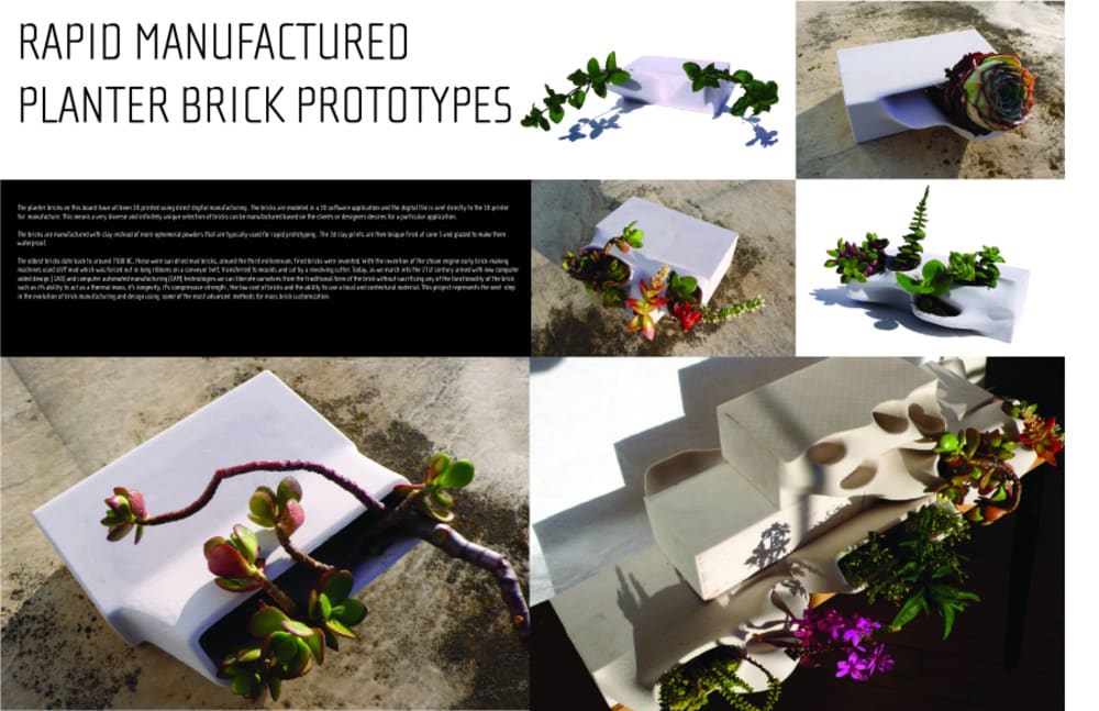 The planter bricks are 3D printed using direct digital manufacturing . The bricks are modeled in a 3D software application and the digital file is sent directly to the 3D printer for manufacture. This means a very diverse and infinitely unique selection of bricks can be manufactured based on the clients or designers desires for a particular application. The bricks are manufactured with clay instead of more ephemeral powders that are typically used for rapid prototyping . The 3d clay prints are then bisque fired at cone 5 and glazed to make them waterproof.