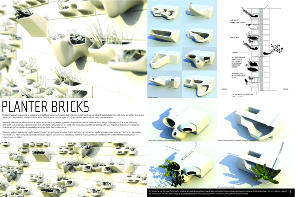 The planter bricks have the potential to counter the heat island effect in big cities through evapotranspiration and pollution conversion and by the light, reflective color of the bricks. Additionally, edible plants such as rosemary and other fragrant herbs with shallow root systems may be planted in the bricks and accessed through openings in the wall. The plants in the bricks will help mediate the temperature of the microclimate surrounding the building, buffer sound and filter the air. The plants held in the planter bricks will be fed water and nutrients through drip irrigation lines that are built into the cavity of the masonry wall.