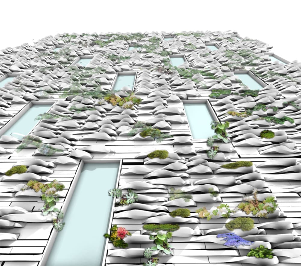 The planter bricks are made by direct digital manufacturing and rapid prototyping technology. Ceramic particles are printed and held together using an organic binder and then fired in a kiln just like traditional bricks. The bricks may be assembled in a load bearing cavity wall condition or installed as a traditional masonry curtain wall would be on a steel or concrete frame building and can be installed new or retrofitted.