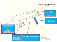 The device takes the external shape of a standard 35 m/m film canister with a protruding “tail” piece that houses the digital sensor array. All electronics, rechargeable battery and image storage memory are contained within the “canister” portion of the device.