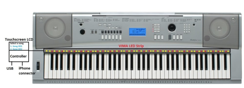 The VIMA (Virtual Instrumental Music Assistant) can be used to help play music on a regular piano or a digital or electronic keyboard with no knowledge of music. It will be an RGB LED strip which can be placed right above the keys on a 61-key/76-key or 88-key keyboard. The user will be able to select a song from a touch screen LCD. The song when played, will turn ON/OFF the respective note's LED. This will indicate that the user needs to play the key right below the lit LED to play the correct music note. As the song plays in the controller, the respective LEDs will get lit.