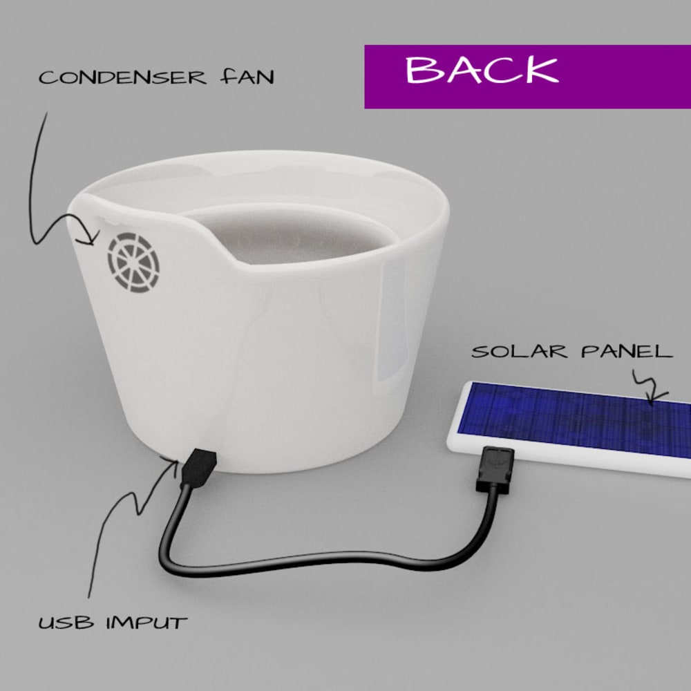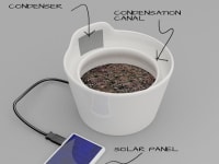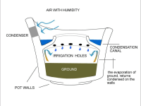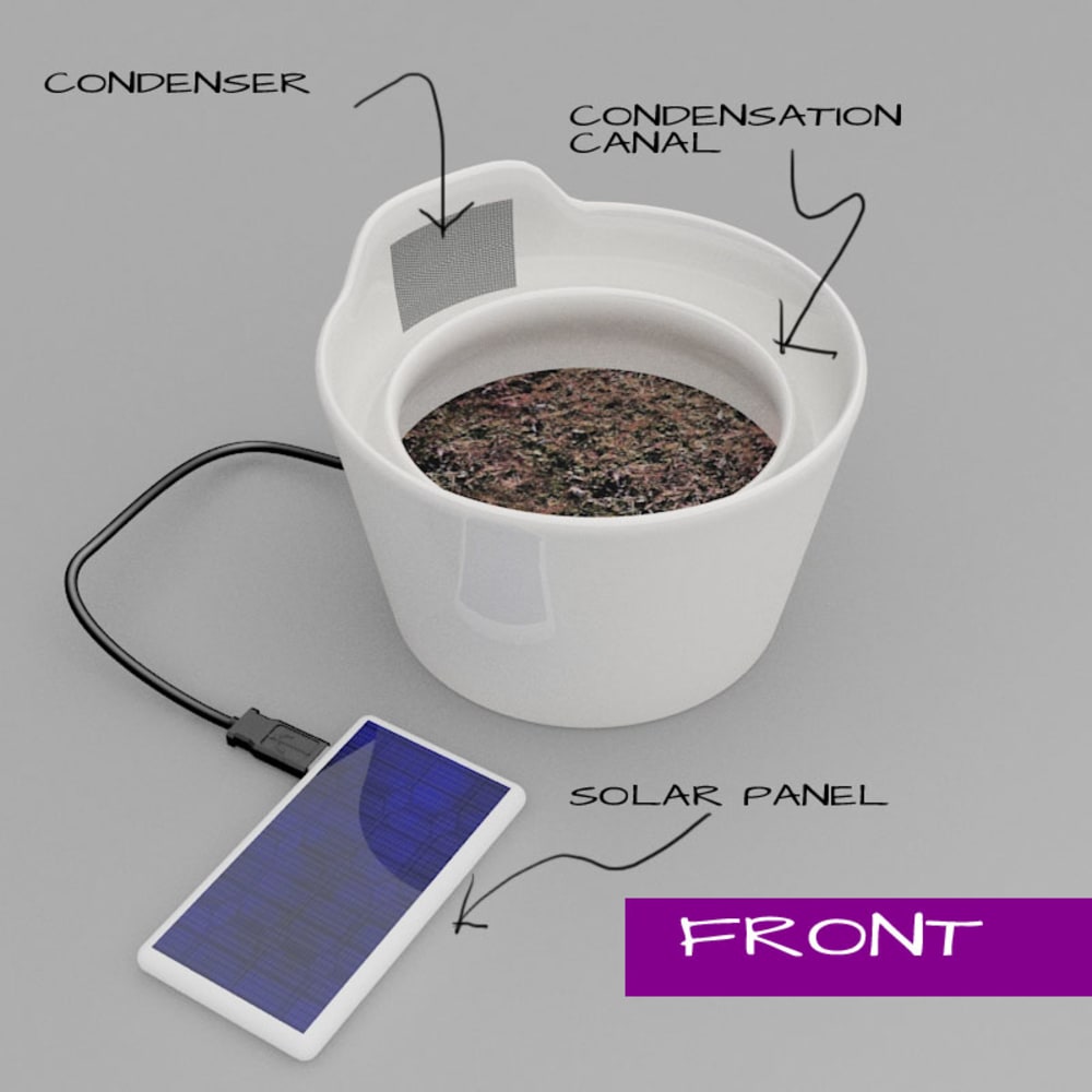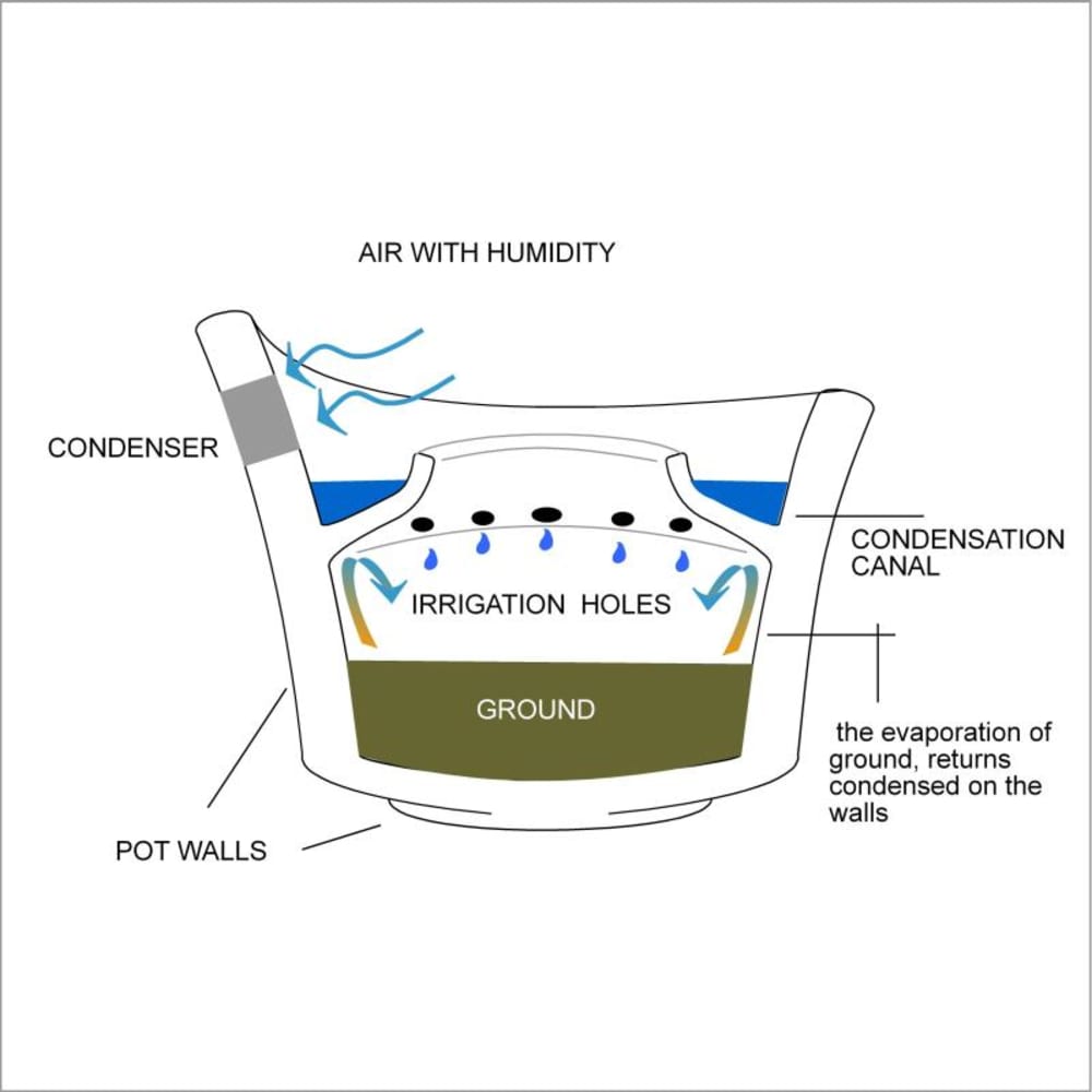A little pot with a condenser that works with the energy of a solar panel, on the day the batteries are recharged, and at night the fan starts, which cools the condenser causing the water to be deposited in an internal canal with small holes, irrigating the plants through drip almost without human intervention.
