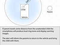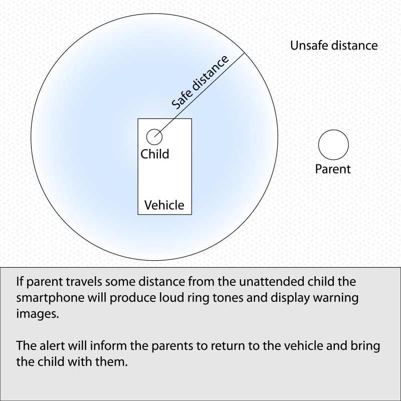 The system is composed of two elements; a pressure sensing device placed on a car seat, and a smart phone app. The pressure sensing device activates a GPS chip and Bluetooth transmitter when a change in pressure is detected. This alerts the smart phone and displays an icon that shows a child in a car seat. The distance of the parent to the child’s car seat is calculated. When this distance exceeds some threshold the app takes control of the users phone and creates a loud, visually distracting image that alerts the parent that the child is left in the vehicle. After removing the child from the car seat the pressure sensing device sends a signal to the phone, and the app displays an empty car seat. If the parent does not respond to the initial alert after some time emergency contacts are automatically called (i.e. work or spouse phones). If emergency contacts don’t pick up in a reasonable amount of time, the app can be preconfigured by the user to alert emergency services with the location of the vehicle.