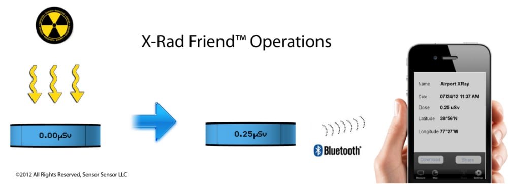 The worlds first personal X-ray radiation dosimeter that works with your smart phone to give you real-time, location-specific readings and keeps track of your accumulated dosage. X-Rad Friend™ in an easy-to-use consumer oriented wristband or clip.