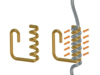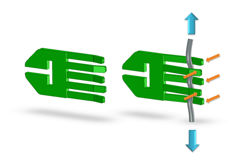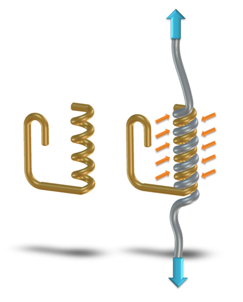 As illustrated, the tension in the wire causes elastic deformation in the strain relief comb which increases the frictional force to the wire. In the case of the strain relief helix, the strain in the wire is transferred to the helix and transformed into friction. Most current strain relief systems cannot be removed after installation and rely on the cable to take the strain from the shock.