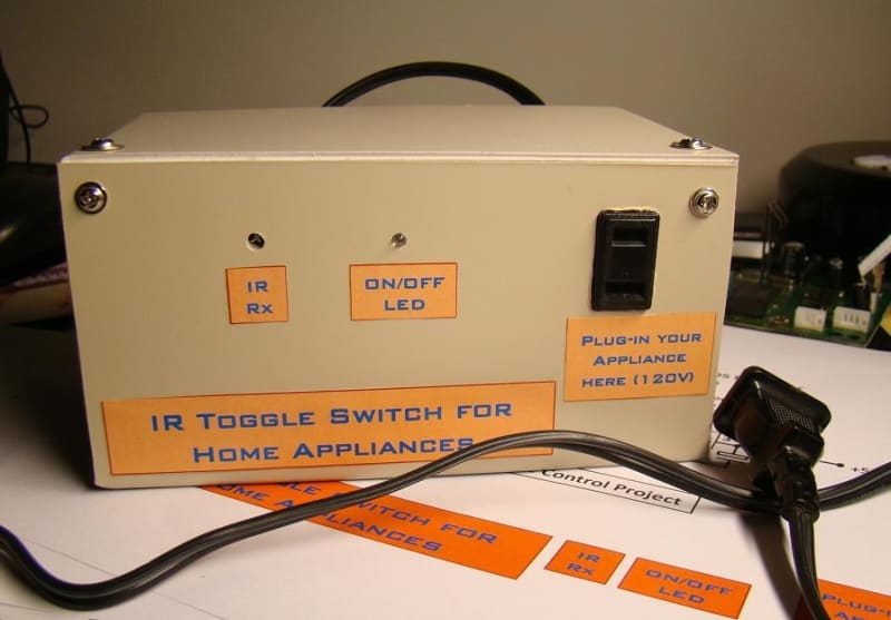 The infrared (IR) toggle switch project described here aims to provide a control mechanism for electrical appliances that do not have remote operation features. The goal is to construct a black box where you can plug-in your 120V AC appliance and control ON and OFF operations with any modern IR remote control devices.