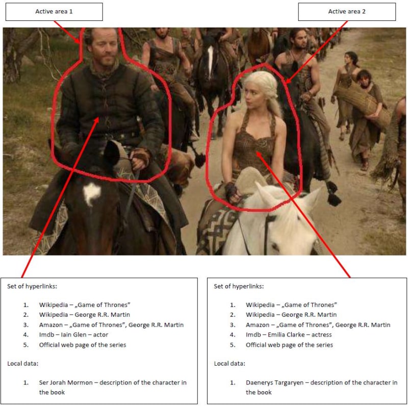 Each frame of the video or the sequence of frames have defined active areas and each active area have assigned hyperlinks pointing on source of additional information about object visible in active area.