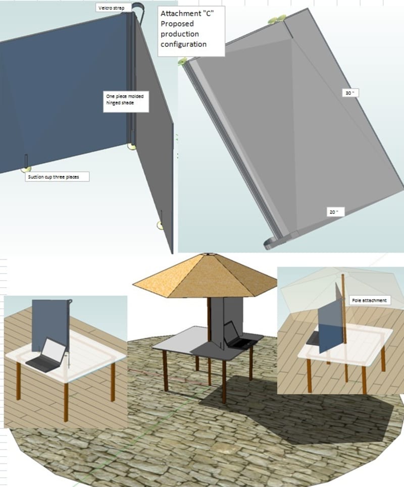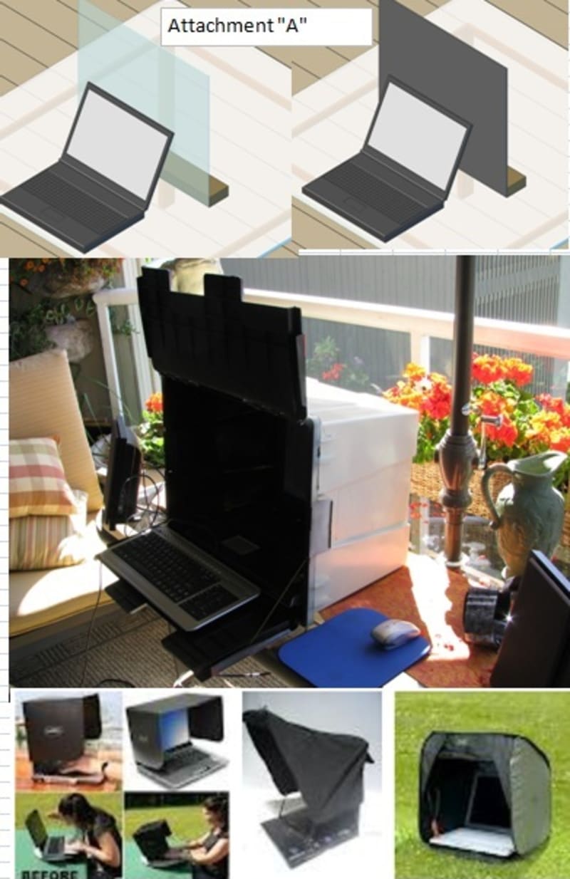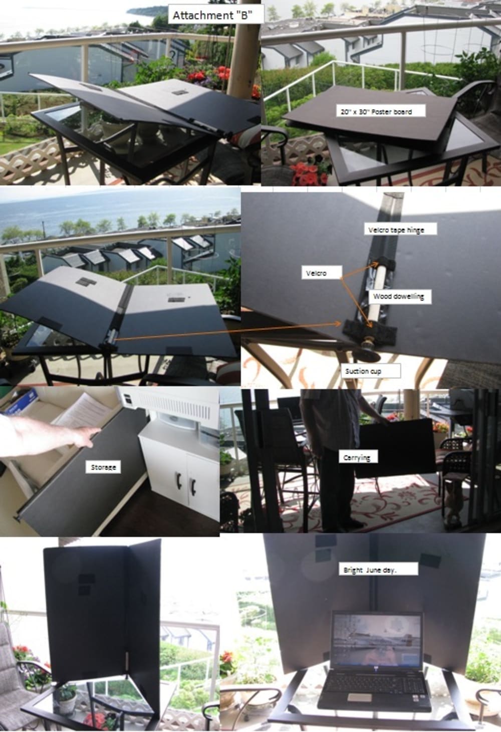 After experimenting I discovered that the most important feature appeared to be providing a barrier with sufficient height. This turned out to be about 30 inches. Windy conditions with this height turned out of course to be a problem. I also wanted it to be easy to carry, set up, and store. Attachment "B" shows the prototype results. My deck has a southern exposure on an ocean shore slope and it has been totally satisfactory for me. It does not remove reflections from the user side, but I found in reality that once sitting at the laptop this is not an issue.The prevailing wind is offshore so I have needed no more than one suction cup to keep the screen from blowing over. On the suggested production model I am showing three suction cups and an option to use Velcro strap to maintain stability for winds from any direction. Anybody wishing to make one similar to the prototype is more than welcome.