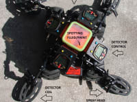 The Spot Metal Detector is a metal detecting system designed to scan and indicate the location of underground metal objects with a marking fluid or paint. The device vastly improves the abilities to scan large areas for metal objects accurately and safely from a remote location.