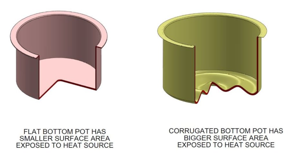 With the corrugated bottom cooking pot, the same amount of water, in the same size pot, on the same source of heat, will boil quicker compared to the flat bottom pot resulting in savings of energy.