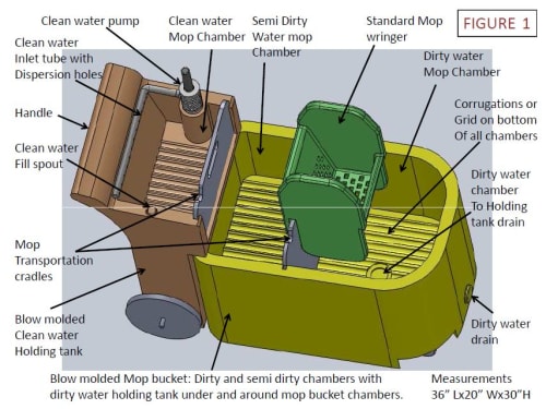 This invention uses blow molding technology to create a self contained Clean Water Mop Bucket System. There would be three separate water compartments, Clean, Semi Clean and Dirty (see Figure 1).