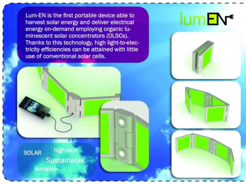 Lum-EN is the first portable device able to harvest solar energy and deliver electrical energy on-demand employing organic luminescent solar concentrators (OLSCs). Thanks to this technology, high light-to-electricity efficiencies can be attained with little use of conventional solar cells.