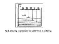 (1) Water level Monitoring: Five resistors R1 to R5 are connected in series and the junctions of resistors are extended to the five levels of the water tank using wires. A reference rod is also fitted with its lower end just below level 1. Plug in a dummy resistor of 100k into SOC1 and rotate dial 1 to the zero-resistance position. Adjust dial 2 to read 55 in the display. Cover the unit digit with an opaque tape so that only the ten's digit is visible. Now remove the dummy resistor. Connect the other end of five resitor ladder and the reference probe to SOC1. The display will show the water levels fron one-fifth to five-fifth of the tank depending on the actual level at that time. Fig 2 shows connections for water level monitoring