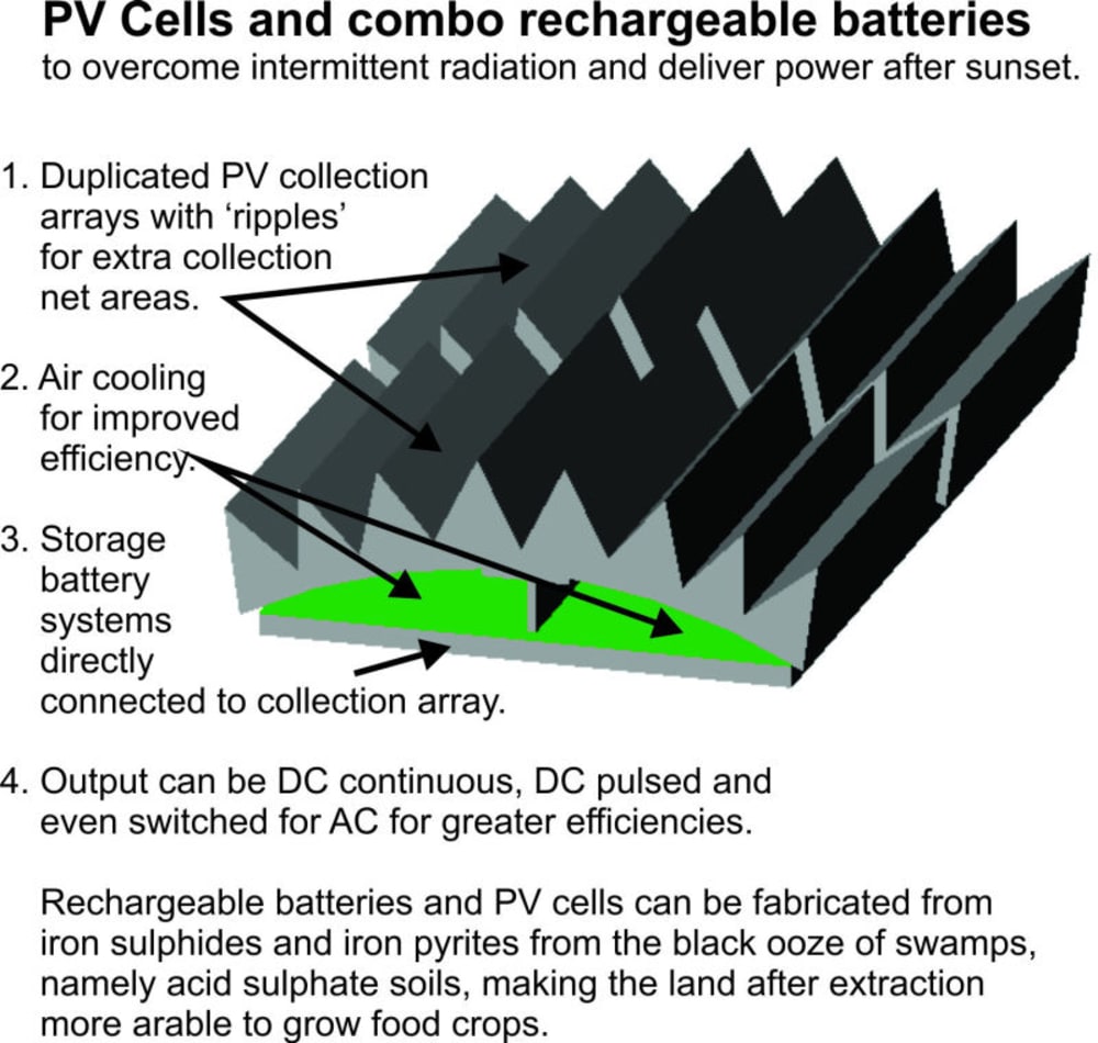 from the black ooze of the nearby swamp, commonly known as (ASS) acid sulphate soils, iron sulphides and iron pyrites can be extracted to make the combination iron pyrites PV cells with lithium iron sulphide rechargeable batteries and integrated output switching. While the efficiency is low,