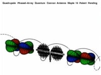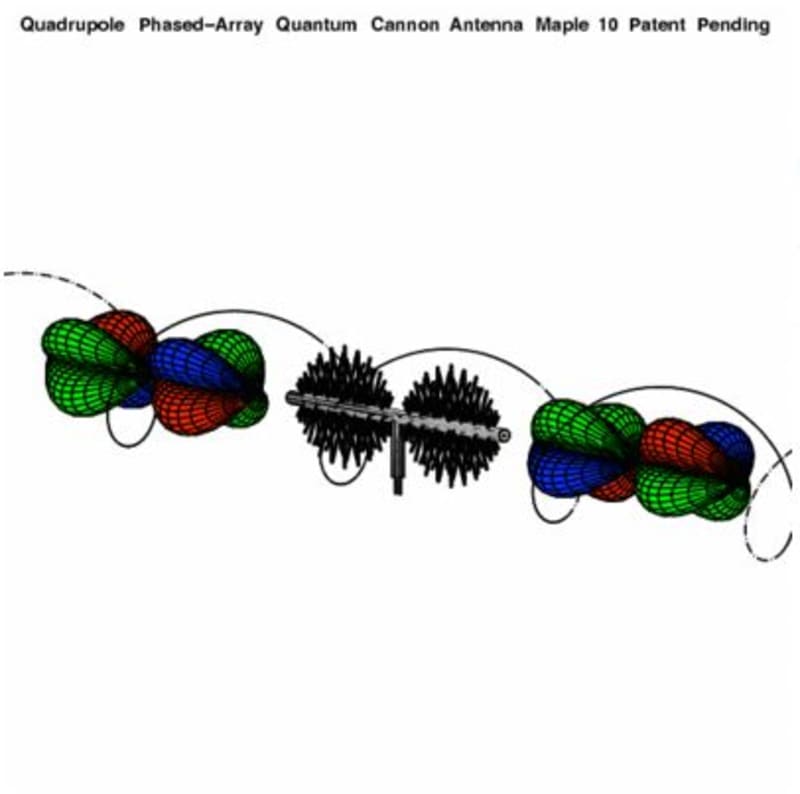Quadrupole phased-array antenna configuration of multiple dipole antenna elements of sinusoidal incremental phase-shifted longitudinal and transverse dimensions; whereby the incremental longitudinal and transverse phase-shifting energization of the quadrupole antenna elements, substantially generates equal and opposite circularly polarized traveling electromagnetic waves of equal and opposite radiation pressure along equal and opposite Sector Power Ratio (SPR) radials. Whereby the present invention (patent pending) embodies a variable dipole antenna element incremental density (i.e., resolution) and includes a suitable dielectric material 8 to achieve the objective of coupling the electromagnetic dipole radiation of 2,3,4,5,11 into the quadrupole radiation of two equal and opposite traveling circularly polarized one wavelength wavetrains (i.e., one wavelength wavepulses) of equal and opposite radiation pressure; wherein for example, a recoil wave 2,5,11 moves to the left in FIG. 2B and a projected wave 3,4,11 moves to the right along the equal and opposite SPR radials of the quantum cannon antenna boresight.