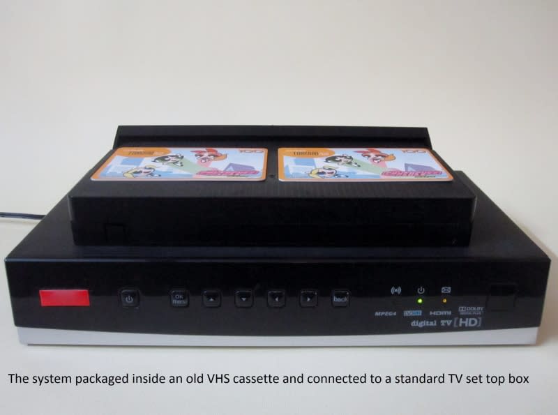 Though much smaller, the prototype shown in the image is packaged inside an old VHS cassette. The flap opens to accommodate connections and shuts close when disconnected. We have strong plans to up-cycle already manufactured but unused cassette shells and also use existing machinery to produce more if required. This would cut tooling costs and as a design element, it gives a retro feel to the device when used with TVs.