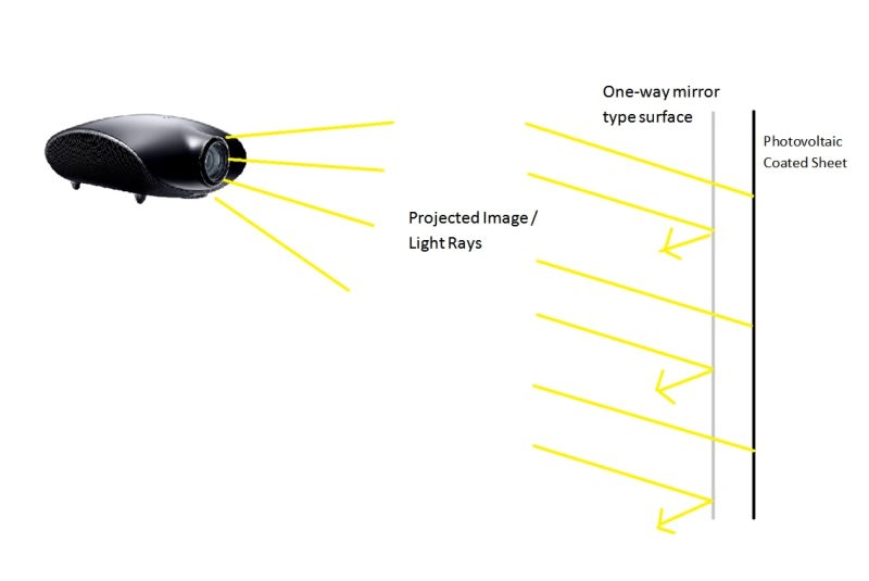 Currently, all projector screens are merely blank faces which reflect back light. This light is largely wasted. Although still in the very early stages of development, the idea is to create a projector screen that would be able to absorb light energy from the projector as well as reflect sufficient lighting back to the audience. As I am currently a high school student, I am not quite sure how to achieve this. A possibility could be to perhaps utilize a set of reflecting mirrors which reflect back into the audience and into the photo-voltaic cells behind. Also, one-way mirror technology may also do the trick. Later development and improvements could surely increase efficiency, with the goal being near self-sufficiency.