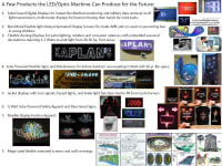 My intention is to build LED/Optic Display production machines specifically designed for Green Energy applications installing flexible displays (including digital) into large banners, marine applications, retail, and consumer awnings and safety applications to start. To power an LED/Optic display covering an area of several dozen square feet requires less than 1 watt in most cases compared to 100's of watts required by any other lighting technology in use today including LEDs.