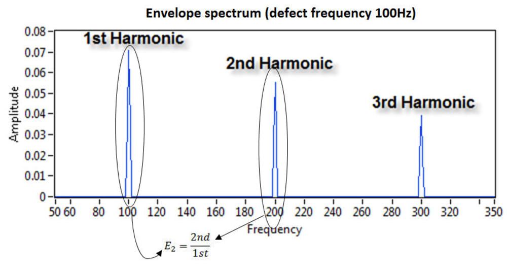 McFadden and Smith introduced a model based on high frequency Resonance Technique for multiple defects in the paper “The Vibration Produced by Multiple Point Defects in a Rolling Element Bearing.” They used a formula (equation below) to estimate the amplitude of defect frequency and its harmonics, by the location and size of defects as the known variables. In real situations, the location and size of defects are unknown and amplitude of defect frequency and its harmonics are known. To use this formula in real situations, the relative amplitude of defect frequency harmonics should be used, since this formula multiplies by other factors to make the amplitude of defect frequency and its harmonics. The relative amplitude from the experiment has to be equal with relative amplitude from the equation below.