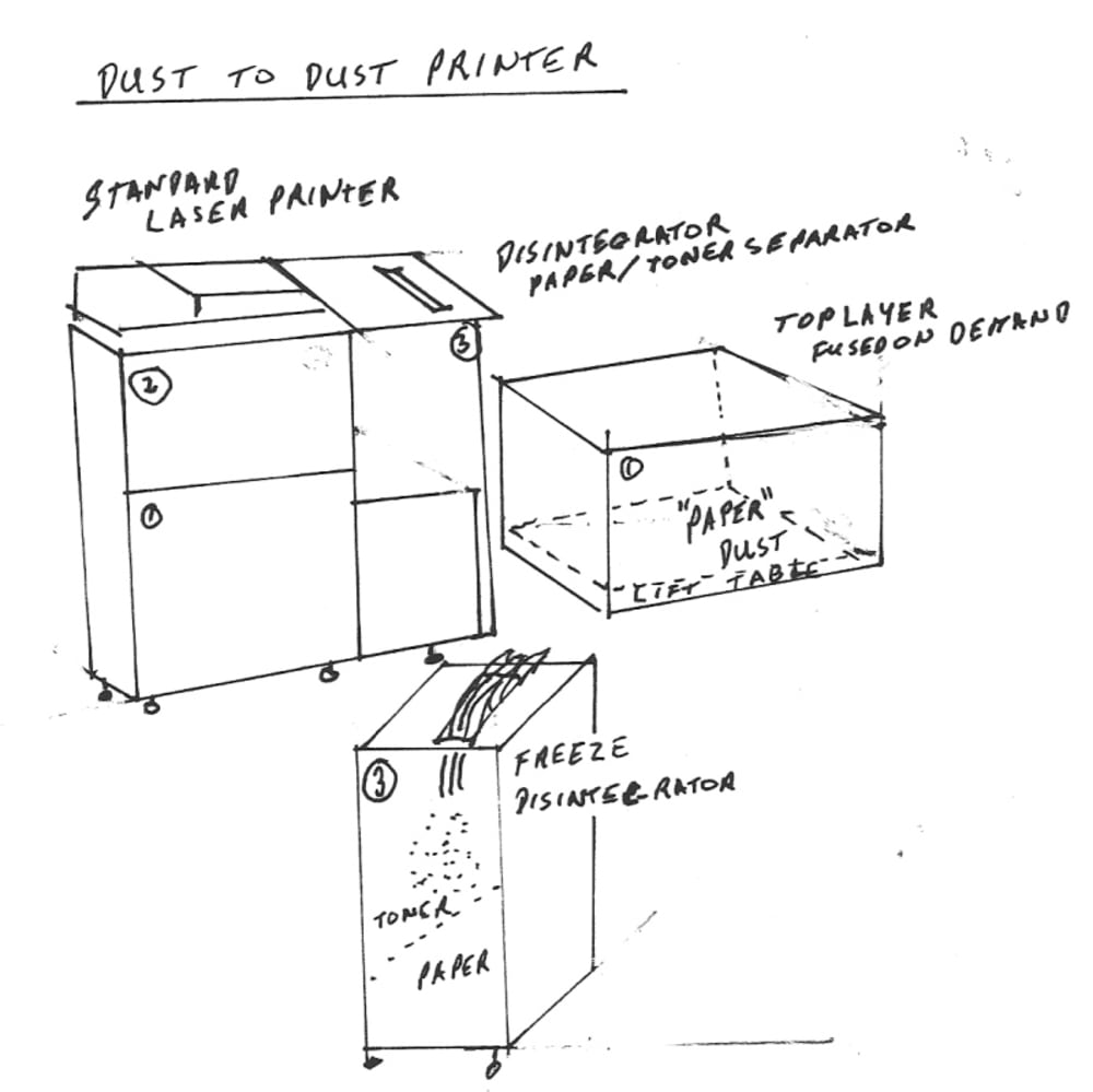 The Dust to Dust Printer takes things a step farther. Since paper is a 3 dimensional object, the Dust to Dust Printer also prints the paper.