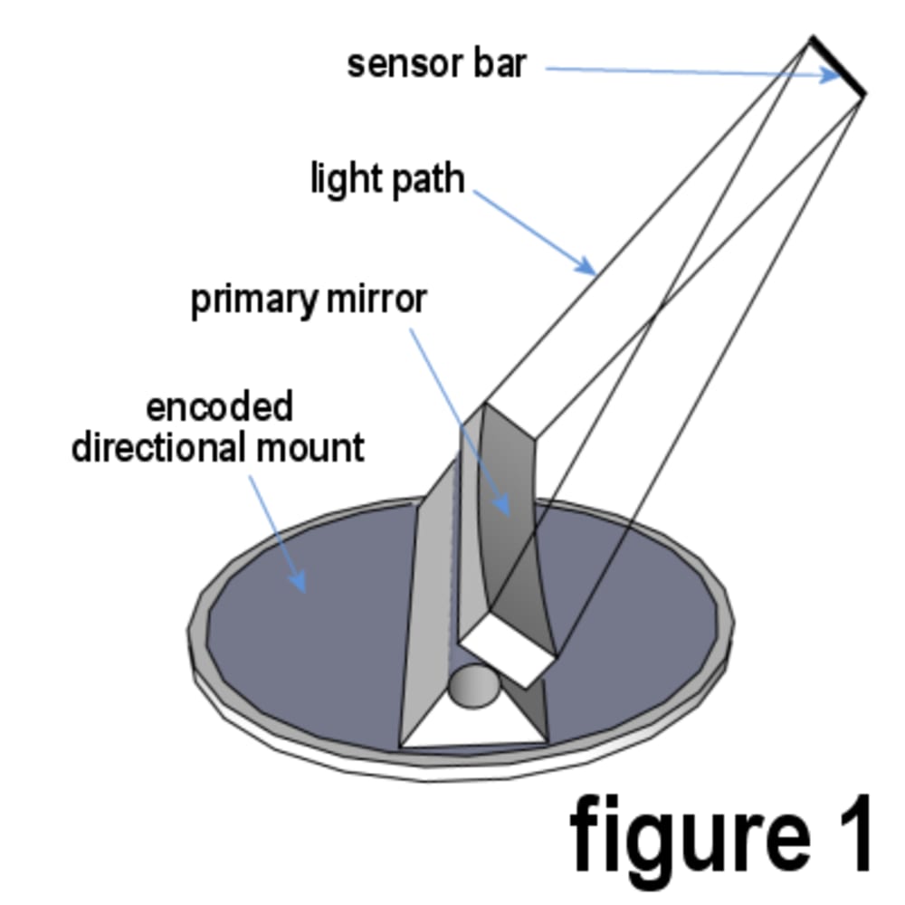 This telescope design consists of a primary mirror shaped to a parabola along a single axis. Whereas a conventional telescope focuses light to a single point, the Single-Axis Telescope spreads its focus along a sensor the same width as the mirror.