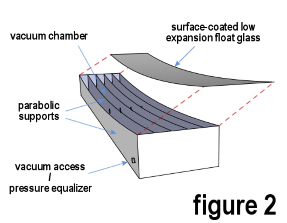 A well performing telescope mirror needs to be shaped to very exacting tolerances. Although the best mirrors are ground and polished from a single piece of solid low-expansion material, it should also be possible to build the primary mirror by vacuum-adhering a surface coated mirror of a sufficiently consistent thickness to a parabolic structure as shown in figure 2.