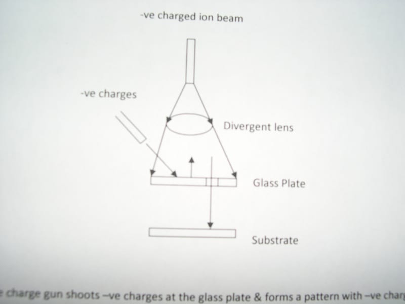 4/ The pattern formed with –ve charges on the glass plate will repel the ion beam light while the area with no –ve charges on the glass plate allows ion beam light to go through.