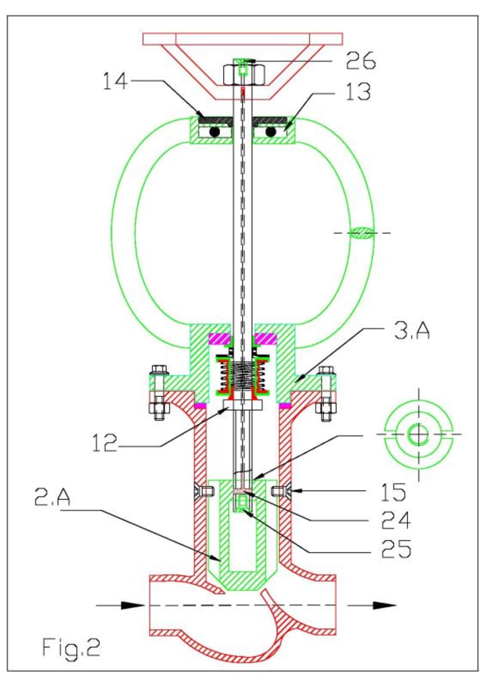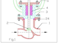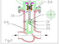 Sealing arrangement: The valve spindle has a step12 as shown the figure. The seal box 3.A is fixed to valve body1 by nut and bolt. Mechanical seal is assembled to the valve spindle above the step region. Above the step is the rubber bush 16 which fits tightly to the valve spindle. Above the bush 16 is metallic ring plate 21 which snug to the rubber bush 16. Above the plate 21, is bellow 17. The bellow is bonded to the ring plate by glue. Another metallic plate19 is glued with the bellow at the top as shown. The top of the metallic plate 19 is bonded with a rotary seal 18. A rubber bush 22 is tightly pressed inside the bore of seal housing 3.A. A stationary seal 23 is bonded to the rubber bush 22. The IDs of stationary seal 23, rotary seal 18 and metallic plates 21 and 19 are held with clearance with respect to spindle OD. Thus when the hand wheel is rotated the valve spindle rotates, the spindle step 12 also rotates in conjunction with bush 16, metallic plate 21, bellow 17, metallic plate 19, rotary seal 18 whereas stationary seal 23 & rubber bush 22 always remain stationary inside the seal box 3.A. Thus there is relative rubbing on seal faces of 18 and 23.The items 23 and 18 are super finished (lapped surfaces). The spring 20 hold the seal faces intact and automatically compensates for seal wear. A drilled passage is drilled through the center of the spindle with its end closed by grub screws 25 and 26. By opening screw 26 we can inject suitable lubricant oil for lubricating in between outside thread of valve spindle and inside thread of plug 2.A.