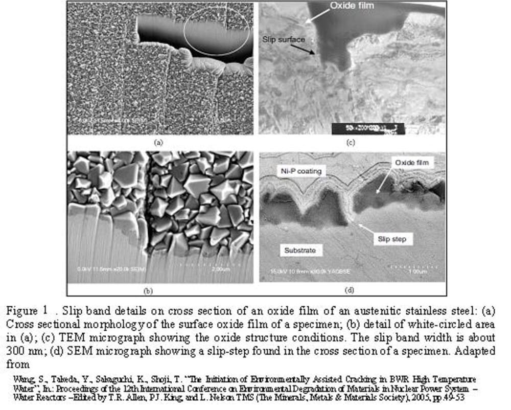 One of the main models which represent the electrochemical and mechanical processes of stress corrosion cracking of nickel alloys and stainless steel in high temperature pressurized water and boiler water reactors is the slip-step dissolution and film rupture model (see oxide film details in Figure 1). It has been extensively built and studied for over 68 years, and some of its aspects are not completely clear. One departs from a bibliographical review of this model, to propose a theoretical alternative modeling [5], joining some critical issues of the review, concerning the mechanochemical effect of the slip-step process, and the formulation of the active path dissolution process: a modified dissolution rate equation which includes the mechanochemical contribution of the slip-step bands action (Figure 2).