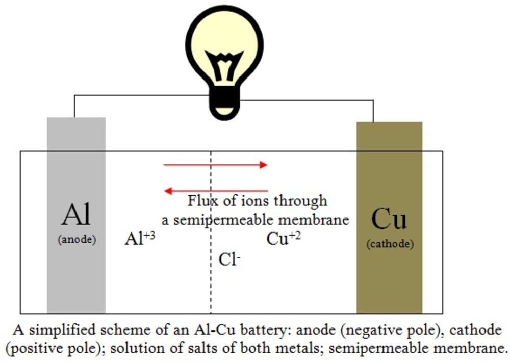 A scheme of the reaction (3) is illustrated in the figure. The flux of ions occurs through a semipermeable membrane. The multiplication of the Equation (1) by 2 and the Equation (2) by 3 was carried out to account correctly for the total number of 6 moles of electrons replaced in the process. A full battery Al-Cu would provide about 12 V of electrical potential if connected six pairs in series, which is the same potential obtained with a lead-acid battery, but giving additional advantages: cheaper costs of manufacturing due to its simplicity of operation when compared with the car batteries where PbO2 is also present, higher durability and higher currents (and thus, lesser internal electrical resistance) due to greater ionic mobility of the chloride ions.