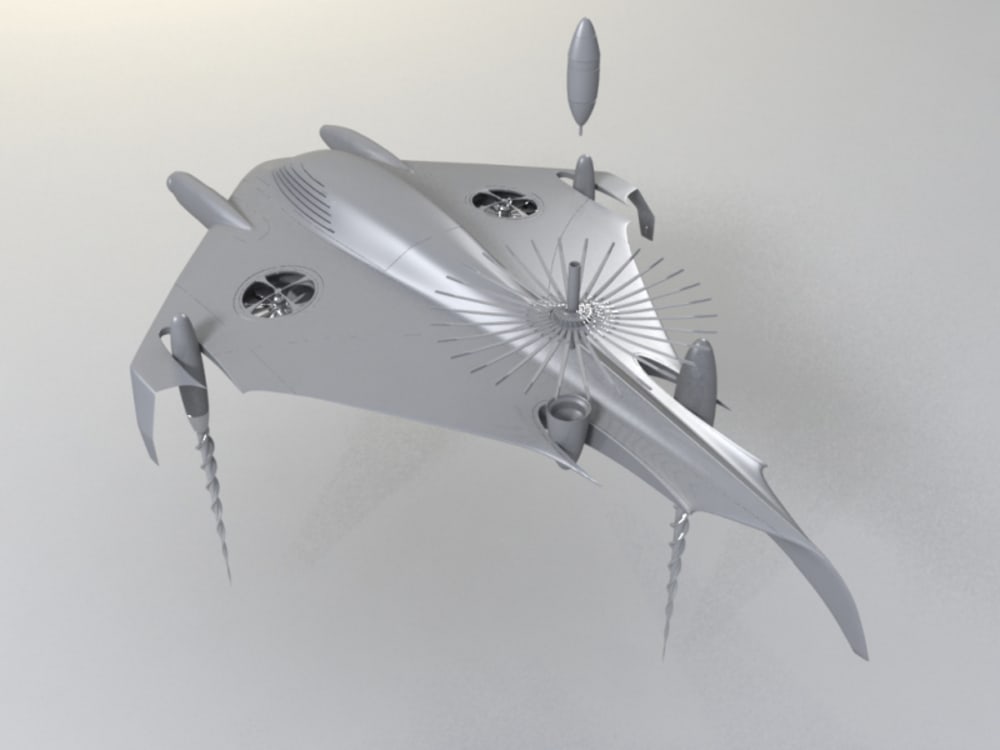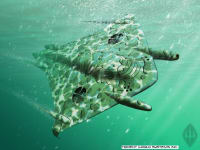 The overall concept of the Manta Ray is based around a unique fuselage design, pulsed water-jet propulsion system, and modular sensor packages. These design factors will allow the UUV to operate in hostile waters, in environments that other UUV’s cannot operate in, and do so for an extended period of time. When the vehicle is moving, it looks and acts more like a fish than a typical cylindrical UUV. This shape allows the vehicle to spread its internal components over a larger “footprint” while still having the internal capacity of larger vehicles. The flat design of the Manta Ray allows the vehicle to remain closer to the floor of the sea or river floor with less chance of detection. The flatter, teardrop design allows the vehicle (when the mission requires) to “hang” additional stores under its wings. This enables the vehicle to not only carry its own modular payloads, but also carry a variety of other sensors, both defensive and offensive, making it a multi-use platform.