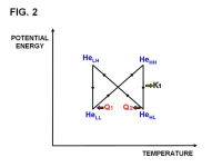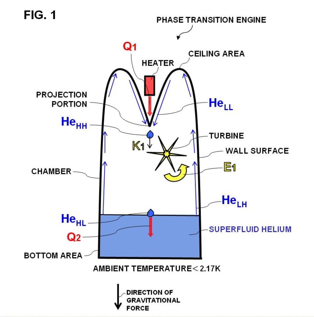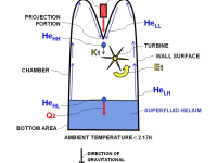 Then the normal-fluid helium HeHH (High-temperature and High-potential energy) falls from the projection portion. The potential energy is converted to kinetic energy K1. Part of the kinetic energy K1 may convert to rotational energy E1 by a turbine.
